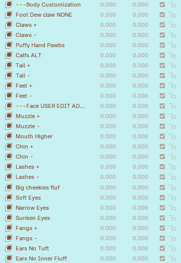 Sliders: Coat/Clothing Variations, Face Shape, Chest Size, BMI, Ear Types, Face Shape, Horn Types, Chest Types